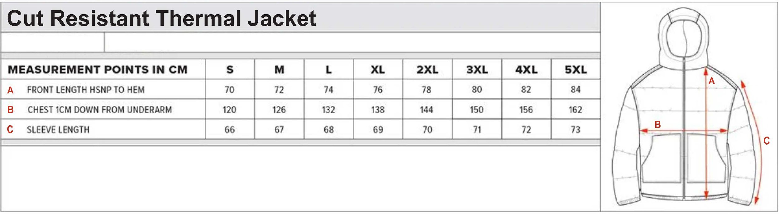 This thermal jacket is made with polyester and is water resistant. Inside contains crystal cotton for warmth is lined with a cut resistant material called DSM Dyneema to provide protection from the unknown while still being stylish and warm.
